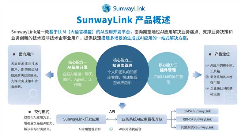 SunwayLink是一款基于LLM(大語(yǔ)言模型)的AI應(yīng)用開發(fā)平臺(tái),面向期望通過AI應(yīng)用解決業(yè)務(wù)痛點(diǎn)、支撐業(yè)務(wù)決策和業(yè)務(wù)創(chuàng)新的技術(shù)或非技術(shù)企事業(yè)用戶,提供快速搭建多場(chǎng)景的生成式AI應(yīng)用的一站式解決方案??梢蕴峁┝奶熘帧⒅悄荏w、工作流三種應(yīng)用開發(fā)能力,開發(fā)好的應(yīng)用可快速封裝為API,可由后端或前端應(yīng)用直接調(diào)用,提供基于RAG(檢索增強(qiáng)生成)技術(shù)的可視化知識(shí)庫(kù)構(gòu)建能力,快速接入結(jié)構(gòu)化和非機(jī)構(gòu)化數(shù)據(jù)構(gòu)建個(gè)人和企業(yè)知識(shí)庫(kù)。