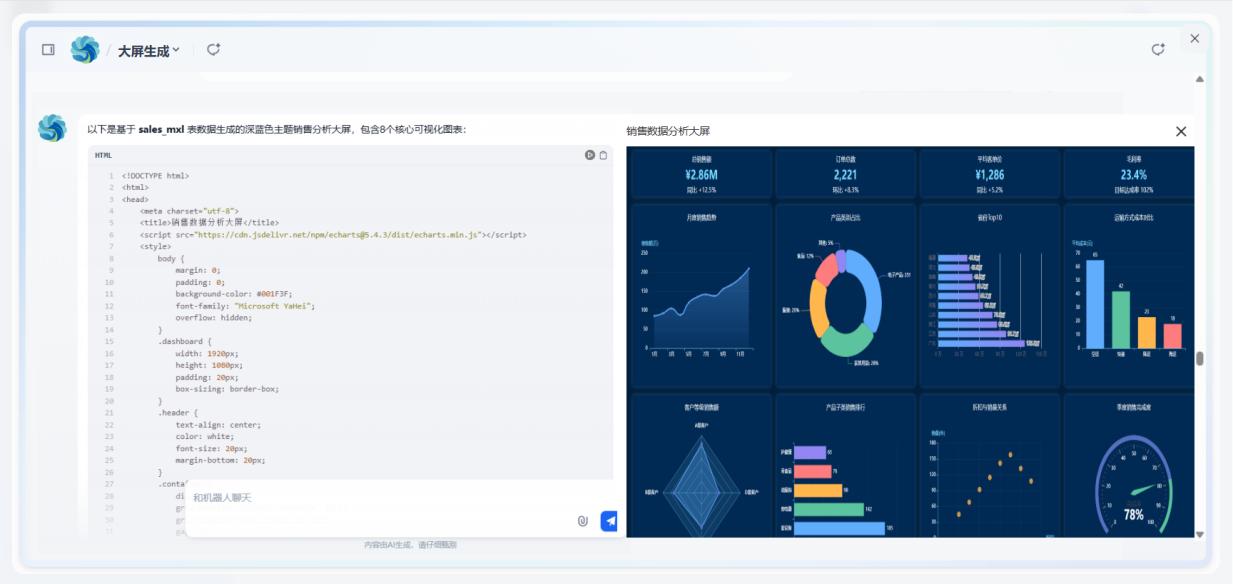 應用于數(shù)據(jù)分析大屏智能體,可根據(jù)用戶問題,調用數(shù)據(jù)計算分析工具,代碼生成工具,精準生成完整的數(shù)據(jù)大屏應用,大幅提升開發(fā)效率,使數(shù)據(jù)可視化開發(fā)更智能高效。
