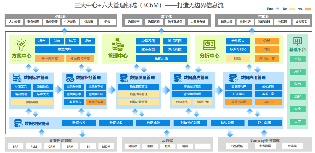 北京三維基于在主數(shù)據(jù)管理領(lǐng)域深耕細(xì)作,整合為眾多特大型央企和集團(tuán)型企業(yè)的項(xiàng)目建設(shè)經(jīng)驗(yàn),融合了數(shù)據(jù)標(biāo)準(zhǔn)管理、數(shù)據(jù)生命周期管理、數(shù)據(jù)交換管理、數(shù)據(jù)質(zhì)量管理、數(shù)據(jù)清洗管理、數(shù)據(jù)應(yīng)用管理六大模塊,方案中心、分析中心、管理中心三大中心以及Mobile移動(dòng)辦公,打造3C6M—體化主數(shù)據(jù)管理解決方案,為客戶(hù)提供從標(biāo)準(zhǔn)建立、數(shù)據(jù)質(zhì)量管控、數(shù)據(jù)交換應(yīng)用、數(shù)據(jù)治理,到企業(yè)數(shù)據(jù)方案中心建設(shè)、數(shù)據(jù)場(chǎng)景化的深入應(yīng)用、智能化數(shù)據(jù)管理、智能化運(yùn)維等全面的管控、洞察、應(yīng)用一體化解決方案,為企業(yè)數(shù)據(jù)標(biāo)準(zhǔn)化建設(shè)、數(shù)據(jù)治理提供強(qiáng)大支持,助力企業(yè)實(shí)現(xiàn)無(wú)邊界信息流。