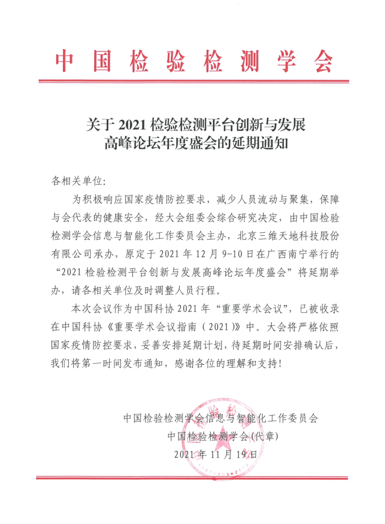 關于2021檢驗檢測平臺創(chuàng)新與發(fā)展高峰論壇年度盛會的延期通知