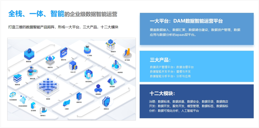 2023年10月26日,2023三維天地?cái)?shù)據(jù)資產(chǎn)高峰論壇在北京成功舉辦。期間全新一代的數(shù)據(jù)資產(chǎn)管理平臺(tái)(DAM)v13正式與廣大用戶見面。 全新版DAM V13是基于客戶需求變化而進(jìn)行的一次功能迭代。平臺(tái)吸收了100+項(xiàng)目實(shí)施過程中用戶提出的重要需求,進(jìn)行統(tǒng)一歸納分析提煉,作為階段性需求進(jìn)行新功能開發(fā),新版本將更貼合項(xiàng)目實(shí)際使用場(chǎng)景,在工具化,自動(dòng)化、智能化的方向走出堅(jiān)實(shí)的一步,以更好地表達(dá)三維天地的產(chǎn)品對(duì)于企業(yè)數(shù)字化轉(zhuǎn)型的支撐價(jià)值。 產(chǎn)品新增了數(shù)據(jù)指標(biāo)、數(shù)據(jù)建模、數(shù)據(jù)標(biāo)簽、人工智能四大模塊,強(qiáng)化數(shù)據(jù)治理、提升用戶洞察力,加速數(shù)據(jù)價(jià)值快速轉(zhuǎn)化的工具支撐;持續(xù)以主動(dòng)元數(shù)據(jù)為核心,結(jié)合機(jī)器學(xué)習(xí)、深度學(xué)習(xí)、自然語(yǔ)言處理技術(shù),對(duì)多模塊功能細(xì)節(jié)進(jìn)行匠心打磨,完善功能閉環(huán),功能點(diǎn)迭代數(shù)量80+,充分提升了智能化水平與數(shù)據(jù)管理效率。 在上一版本的基礎(chǔ)上,DAM V13平臺(tái)底座更夯實(shí)、數(shù)據(jù)治理更高效、數(shù)據(jù)開發(fā)更便捷、數(shù)據(jù)運(yùn)營(yíng)更智能,且擁有更標(biāo)準(zhǔn)及更為閉環(huán)的數(shù)據(jù)治理與智能數(shù)據(jù)分析解決方案。平臺(tái)具備搜索問答式數(shù)據(jù)分析系統(tǒng),問答式交互,搜索式體驗(yàn),將變革數(shù)據(jù)分析流程全場(chǎng)景的數(shù)據(jù)整合,讓數(shù)據(jù)“慧”說(shuō)話;全鏈路協(xié)同的數(shù)據(jù)開發(fā)讓工具回歸為人服務(wù)的本質(zhì),全方位地提升一線數(shù)據(jù)開發(fā)人員/業(yè)務(wù)人員的工作效率。 DAM數(shù)據(jù)資產(chǎn)管理平臺(tái)是全棧、一體、智能的企業(yè)級(jí)數(shù)據(jù)智能運(yùn)營(yíng)平臺(tái),形成了一大平臺(tái)、三大產(chǎn)品、十二大模塊的完整產(chǎn)品矩陣。主要包括治理、開發(fā)、分析三大產(chǎn)品,涵蓋數(shù)據(jù)目錄、數(shù)據(jù)標(biāo)準(zhǔn)、數(shù)據(jù)質(zhì)量、數(shù)據(jù)安全、數(shù)據(jù)開發(fā)、主數(shù)據(jù)建模、數(shù)據(jù)建模、指標(biāo)建模、標(biāo)簽建模、AI人工智能、BI商業(yè)智能、數(shù)據(jù)超市能等12大模塊,支持從數(shù)據(jù)治理到數(shù)據(jù)開發(fā)到數(shù)據(jù)分析的全鏈路的數(shù)據(jù)資產(chǎn)管理能力。 特性一:增強(qiáng)式數(shù)據(jù)目錄 傳統(tǒng)的數(shù)據(jù)資產(chǎn)目錄主要集中在結(jié)構(gòu)化數(shù)據(jù)庫(kù)表管理。而三維天地的數(shù)據(jù)目錄在此基礎(chǔ)上擴(kuò)展了BI看板、ETL作業(yè)、主數(shù)據(jù)模型等類型,可以展示更多樣的數(shù)據(jù)對(duì)象,更細(xì)節(jié)的血緣關(guān)系,更及時(shí)的數(shù)據(jù)特征。 特性二:數(shù)據(jù)質(zhì)量的閉環(huán) 在以往項(xiàng)目實(shí)踐中,客戶不愁發(fā)現(xiàn)問題,而是更注重如何將發(fā)現(xiàn)的問題得以解決、將有問題的數(shù)據(jù)整改到位。因此平臺(tái)支持?jǐn)?shù)據(jù)質(zhì)量的事前、事中、事后的閉環(huán)管理,即事前需求和規(guī)則定義、事中質(zhì)量監(jiān)控以及事后量化分析和問題追溯。 特性三:治理到自助式敏捷應(yīng)用的閉環(huán) 平臺(tái)具備從數(shù)據(jù)治理到自助式敏捷應(yīng)用的閉環(huán)一體化管理。在資產(chǎn)平臺(tái)中,數(shù)據(jù)治理結(jié)束后,平臺(tái)具備商業(yè)智能、人工智能、指標(biāo)管理、標(biāo)簽畫像以及智能應(yīng)用等各模塊,以滿足用戶的個(gè)性化應(yīng)用的構(gòu)建。當(dāng)已有的應(yīng)用無(wú)法滿足訴求時(shí),業(yè)務(wù)人員也可通過數(shù)據(jù)超市自助獲取數(shù)據(jù)、自助分析數(shù)據(jù)。實(shí)現(xiàn)治理到分析的全流程閉環(huán)應(yīng)用。 特性四:基于知識(shí)圖譜的增強(qiáng)數(shù)據(jù)治理 平臺(tái)結(jié)合AI、知識(shí)圖譜,有效提高了數(shù)據(jù)治理的效率,如業(yè)務(wù)域自動(dòng)分類、數(shù)據(jù)標(biāo)準(zhǔn)自動(dòng)生成、數(shù)據(jù)資產(chǎn)推薦、智能血緣推薦等,智能化的功能貫穿數(shù)據(jù)資產(chǎn)平臺(tái)的方方面面。 特性五:數(shù)據(jù)資產(chǎn)合理評(píng)估及入表 在數(shù)據(jù)資產(chǎn)入表的大背景下,產(chǎn)品適時(shí)推出自研的數(shù)據(jù)資產(chǎn)評(píng)估模型,通過對(duì)數(shù)據(jù)資產(chǎn)的成本因素、場(chǎng)景因素、市場(chǎng)因素和質(zhì)量因素等方面進(jìn)行多維分析評(píng)估,為數(shù)據(jù)資產(chǎn)合理定價(jià)及市場(chǎng)流通奠定基礎(chǔ)。 特性六:數(shù)據(jù)開發(fā)和治理一體化 企業(yè)在以往數(shù)據(jù)中臺(tái)的建設(shè)效果不顯著。全新平臺(tái)將數(shù)據(jù)治理的流程與數(shù)據(jù)開發(fā)的全生命周期深度融合,通過數(shù)據(jù)開發(fā)一體化,在數(shù)據(jù)標(biāo)準(zhǔn)驅(qū)動(dòng)模型構(gòu)建基礎(chǔ)上,有序高質(zhì)量地進(jìn)行數(shù)據(jù)生產(chǎn),在數(shù)據(jù)開發(fā)過程中,完成數(shù)據(jù