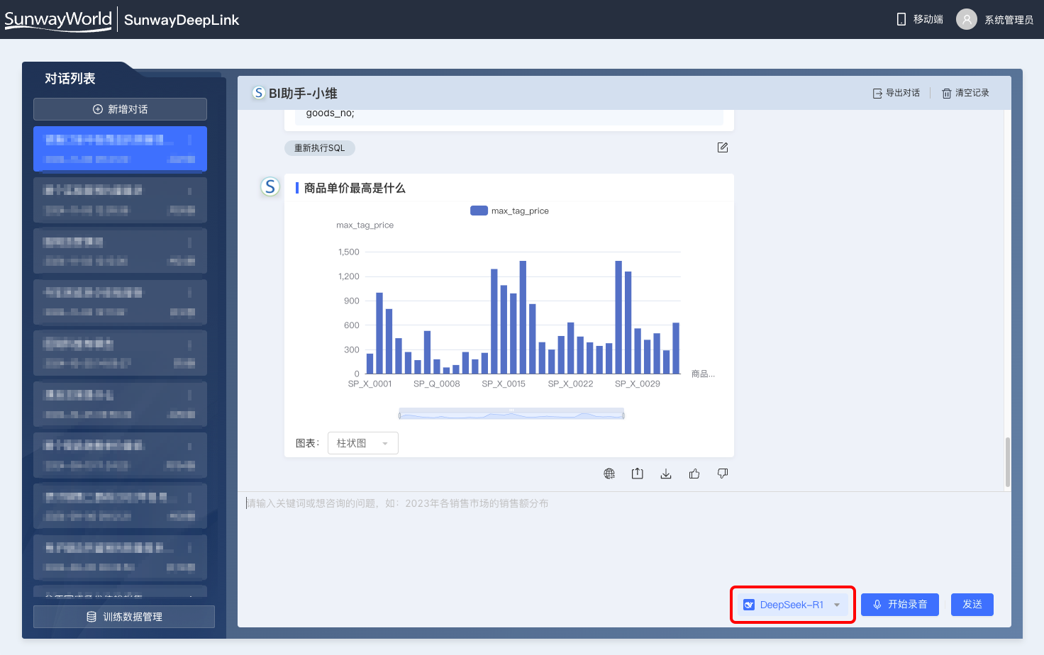 數(shù)據(jù)資產(chǎn),是企業(yè)數(shù)字化轉(zhuǎn)型的核心驅(qū)動力。然而,面對海量數(shù)據(jù),如何高效分析、挖掘價值,如何便捷管理、安全利用,成為企業(yè)面臨的共同挑戰(zhàn)。 告別復(fù)雜操作,對話式分析:只需像聊天一樣說出需求,SunwayDeepLink即可自動生成可視化報表,洞察數(shù)據(jù)奧秘,助企業(yè)領(lǐng)導(dǎo)輕松決策。 多維度數(shù)據(jù)洞察,一目了然:支持多種數(shù)據(jù)源接入,深度挖掘數(shù)據(jù)價值,多維度分析,助客戶精準把握市場脈搏。 智能預(yù)測,預(yù)見未來趨勢:基于DeepSeek強大的計算推理能力,SunwayDeepLink可進行數(shù)據(jù)預(yù)測和趨勢分析,助客戶搶占市場先機。 海量文檔,秒速定位:只需輸入關(guān)鍵詞,SunwayDeepLink即可快速定位目標文檔,告別繁瑣的搜索過程。 智能摘要,快速掌握要點:自動生成文檔摘要,提取關(guān)鍵信息,助客戶快速了解文檔內(nèi)容,提高閱讀效率。 多語言翻譯,溝通無界限:支持多種語言互譯,打破語言障礙,助客戶輕松與全球伙伴溝通協(xié)作。 數(shù)據(jù)無縫對接,打破信息孤島:SunwayDeepLink通過接入DeepSeek-R1和DeepSeek-V3,與DeepSeek實現(xiàn)底層數(shù)據(jù)互通,打破系統(tǒng)壁壘,消除信息孤島,實現(xiàn)數(shù)據(jù)資產(chǎn)的統(tǒng)一管理和高效利用。 功能深度融合,釋放協(xié)同價值:SunwayDeepLink的ChatBI和ChatDOC功能與DeepSeek平臺深度集成,實現(xiàn)數(shù)據(jù)分析、文檔管理、流程審批等功能的無縫銜接,釋放協(xié)同價值,提升工作效率。 安全可靠保障,守護數(shù)據(jù)資產(chǎn):依托DeepSeek強大的安全防護體系,SunwayDeepLink為用戶提供全方位的數(shù)據(jù)安全保障,確保數(shù)據(jù)資產(chǎn)的機密性、完整性和可用性。 DeepSeek-R1加持,數(shù)據(jù)處理更高效:借助DeepSeek-R1強大計算推理能力,SunwayDeepLink的數(shù)據(jù)處理性能提升20%以上,即使面對海量數(shù)據(jù)也能游刃有余。 DeepSeek-V3賦能,分析預(yù)測更精準:憑借DeepSeek-V3強大的技術(shù)支撐,SunwayDeepLink能夠深度挖掘數(shù)據(jù)價值,充分整合各類信息資源,優(yōu)化數(shù)據(jù)分析流程與方法,使數(shù)據(jù)分析預(yù)測準確率提升30%以上,為企業(yè)決策提供更堅實、更可靠的依據(jù)。 三維天地推出的全新人工智能產(chǎn)品SunwayDeepLink,將成為新時期企業(yè)數(shù)據(jù)資產(chǎn)管理的得力助手,助力企業(yè)釋放數(shù)據(jù)價值,為企業(yè)數(shù)智化轉(zhuǎn)型保駕護航。