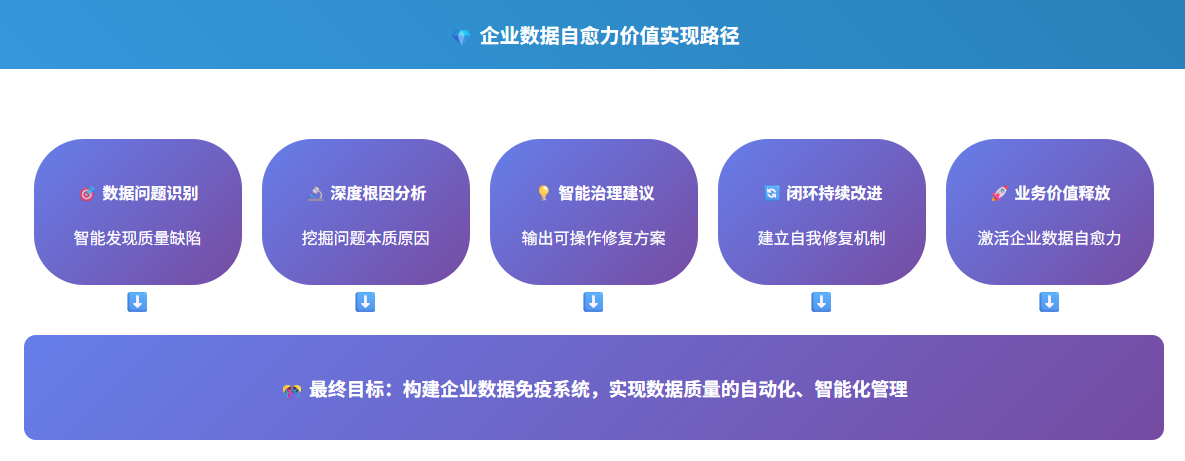 數(shù)據(jù)質(zhì)量智能體通過自然語言處理引擎解析報告中的復雜指標,將專業(yè)術(shù)語轉(zhuǎn)化為業(yè)務可讀性語言,自動標注關(guān)鍵異常點并關(guān)聯(lián)歷史趨勢;結(jié)合知識庫中的業(yè)務場景模型,智能定位影響最大的質(zhì)量缺陷,通過可視化看板動態(tài)推演問題成因與業(yè)務影響路徑,最終輸出分級決策建議 —— 讓非技術(shù)角色也能秒懂數(shù)據(jù)健康度,驅(qū)動精準治理行動。