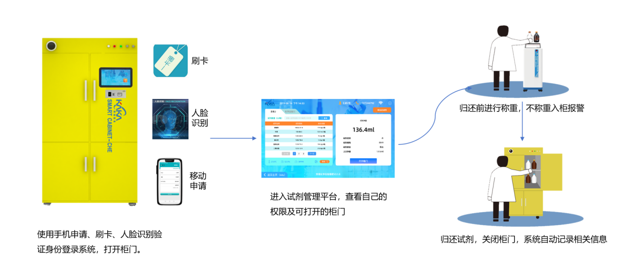 - ?;分悄芄芸?,安全精準(zhǔn)無(wú)憂:創(chuàng)新集成智能試劑柜、RFID標(biāo)簽及人臉識(shí)別技術(shù),構(gòu)建危化品(如易制毒、易爆品)智能安全管理閉環(huán)。系統(tǒng)自動(dòng)校驗(yàn)實(shí)驗(yàn)人員試劑領(lǐng)取權(quán)限,實(shí)時(shí)智能核減庫(kù)存量,并實(shí)現(xiàn)耗材快速定位與自動(dòng)化盤(pán)點(diǎn),安全與效率雙提升。