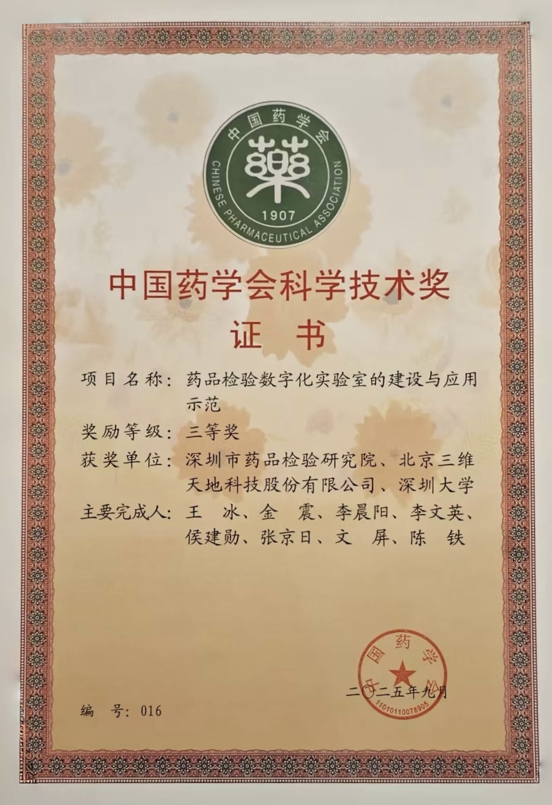 三維天地聯(lián)合深圳藥檢院數(shù)字化實驗室項目榮獲中國藥學(xué)會科技獎